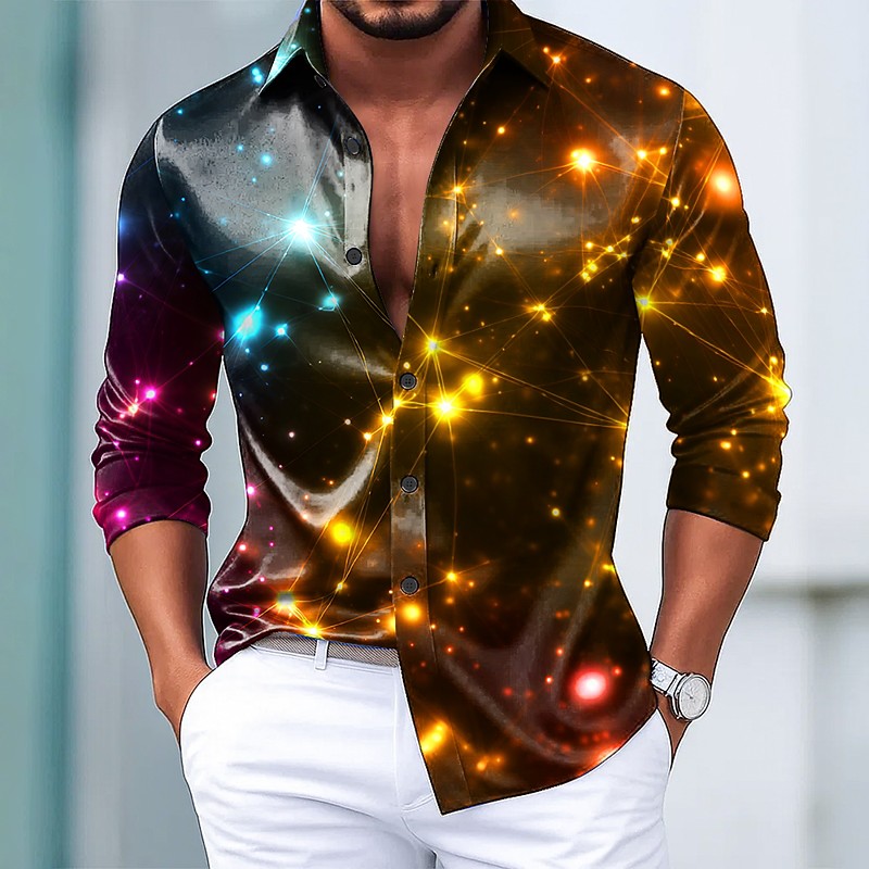 Christmas Men's Sparkling Glitter Gradient Color Christmas Light Shirt Satin Shirt Dress Shirt Long Sleeve Fashion Casual Party Holiday Summer Spring Fall Turndown 3D Print Button Up Shirts Black 1