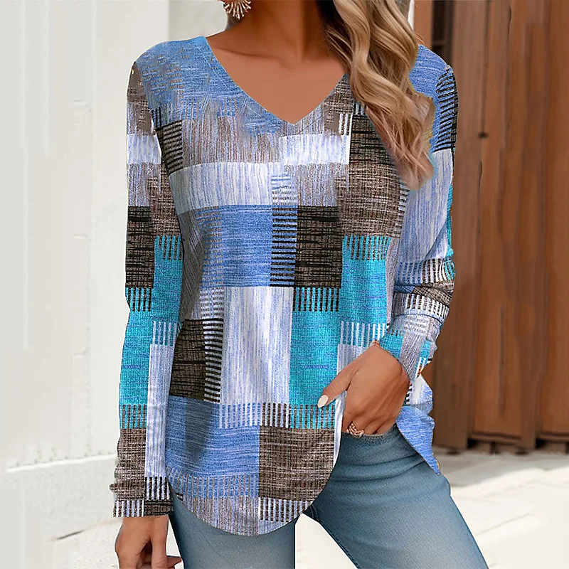 Women's Blouse Color Block Stylish Western Y2K Long Sleeve V Neck Regular Tops Holiday Going out Patchwork Print Yellow Pink Red Blue Green Summer Spring Fall