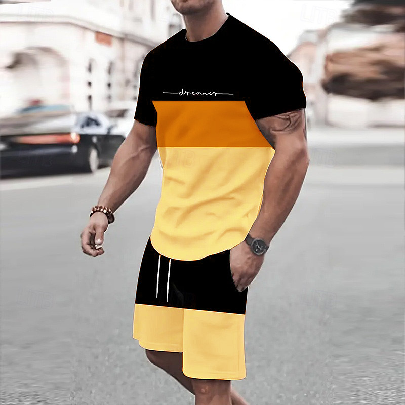 Men's Striped 2pcs Tees sets Summer Tops Short Sleeve Short Pants Crew Neck Sport Casual Outdoor Vacation Sport 3D Print Summer Black Yellow Green