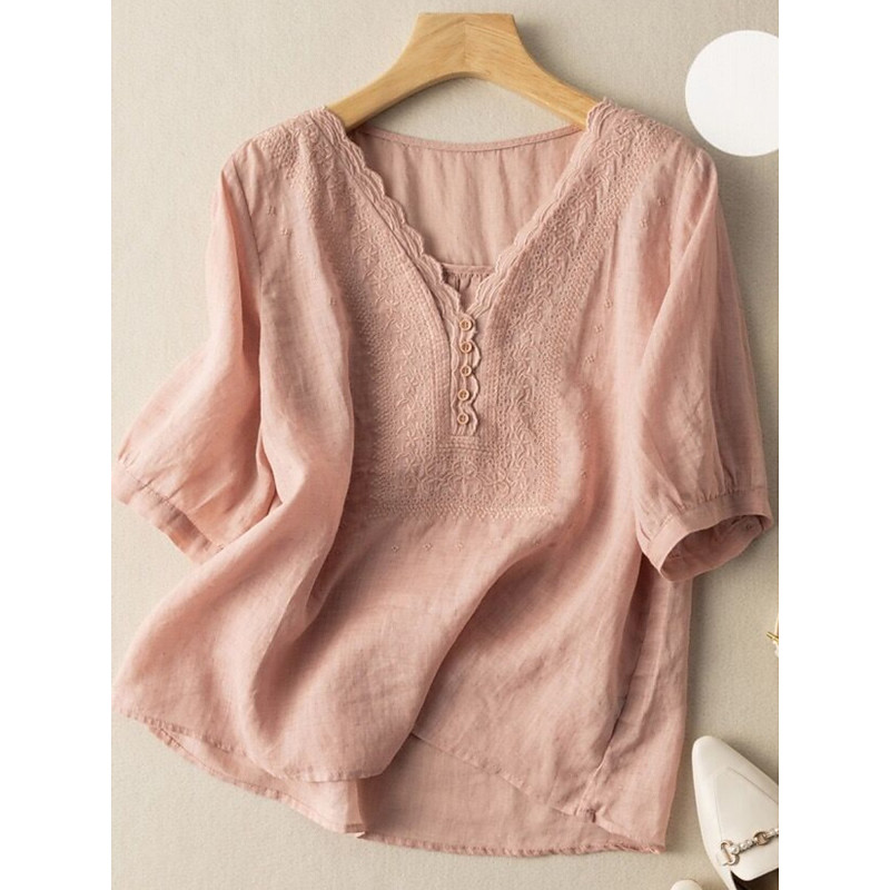 Women's Blouse Solid Color Stylish Casual 3/4 Length Sleeve V Neck Regular Tops Daily Contrast Lace Blue Black White Pink Navy Blue Summer