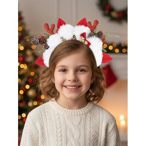 Fascia per capelli da donna con corna di renna natalizia, soffice accessorio per capelli a forma di cappello di Babbo Natale con corna dorate e pompon per feste di Natale, riunioni di famiglia foto