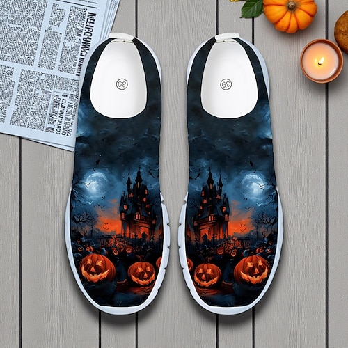 scarpe da ginnastica slip-on arancioni da uomo in Flyknit con stampa di zucche di case infestate – scarpe casual per festival di Halloween, feste notturne, cosplay ed eventi all'aperto
