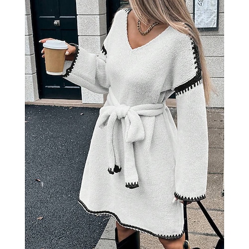 Per donna Mini Abito Abito in maglia Classico Moderno Quotidiano All'aperto Ferie Vestibilità regolare Blocco di colori Manica Lunga Scollo a V Nero Bianco Rosso Grigio chiaro Autunno