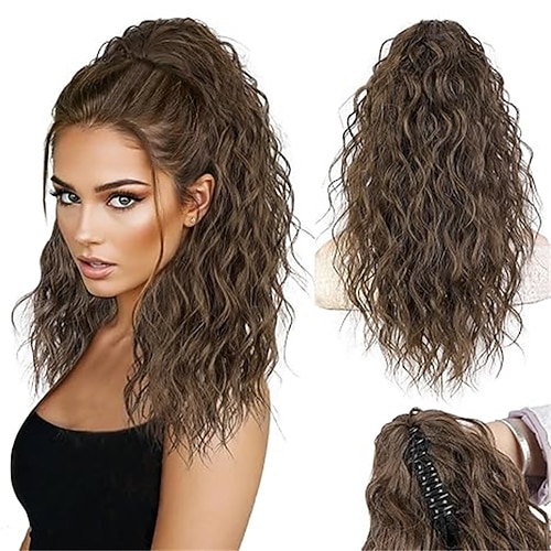 Braune Pferdeschwanzverlängerung, 45 cm (18 Zoll), lockig-wellig, mit Clip-in-Befestigung, mehrlagig, flauschig, natürlich aussehendes Kunsthaarteil für Damen (dunkelbraun), 45 cm (18 Zoll).
