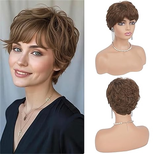 dunkelbraun blond meliert perücke braun mit strähnchen Pixie-Cut Perücken für weiße Frauen mit Pony kurze gewellte Kunsthaarperücke natürliches Echthaar Weihnachtsfeier-Perücken