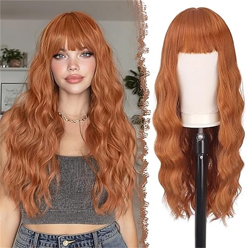 Lange, gewellte, orange-braune Ombré-Perücke mit Pony (66 cm), leuchtend ingwerfarbener Curtain Bangs, hitzebeständige Kunsthaarperücke mit dunklem Ansatz und auburnfarbenen Highlights, ideal für