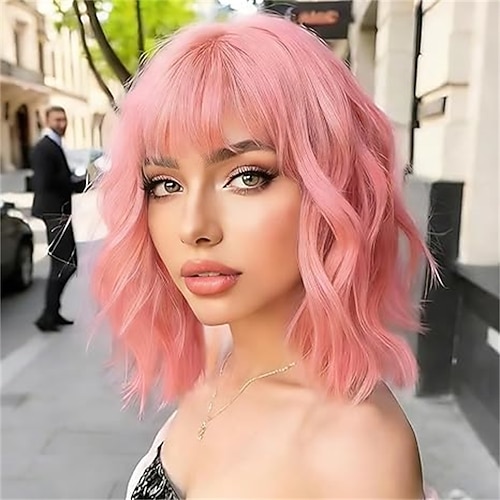 rosa Perücken, kurzes, gewelltes Haar, pastellfarbene Bob-Perücke mit Pony, schulterlanges Kunsthaar für Frauen und Mädchen, farbenfrohe Cosplay-Perücke aus synthetischer hitzebeständiger Faser für
