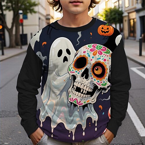 Halloween Jungen 3D Totenkopf T-Shirt Langarm Frühling Herbst Mode Basic Kinder 4-12 Jahre Rundhalsausschnitt Outdoor Casual Alltag Regular Fit