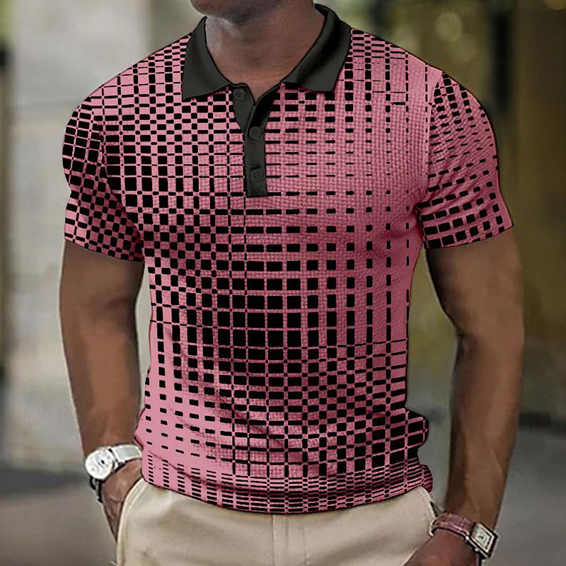 Men's Plaid Waffle Polo Shirts Golf Shirt Short Sleeve Polo Shirts Collared Shirts Vintage Casual Vacation Wear Formal Wear Festival Wear 3D Print Buttons Blue Light Yellow Light Pink