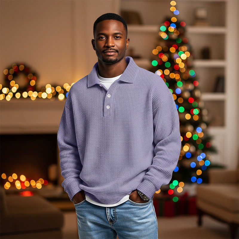 Men's Waffle Polo Shirts Polo Casual Formal Banded Collar Long Sleeve Fashion Solid Color Textured Buttons Plain Fall Spring Fall Fall Winter Regular Fit Black Light Green Navy Blue Purple Light