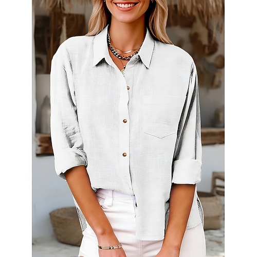 Per donna Camicia Blusa 100% cotone Semplice Vintage Casual Manica Lunga Colletto a Camicia Top Regolari Quotidiano Ferie Uscire Tasca Bottoni Nero Bianco Rosa Verde militare Blu marino Estate