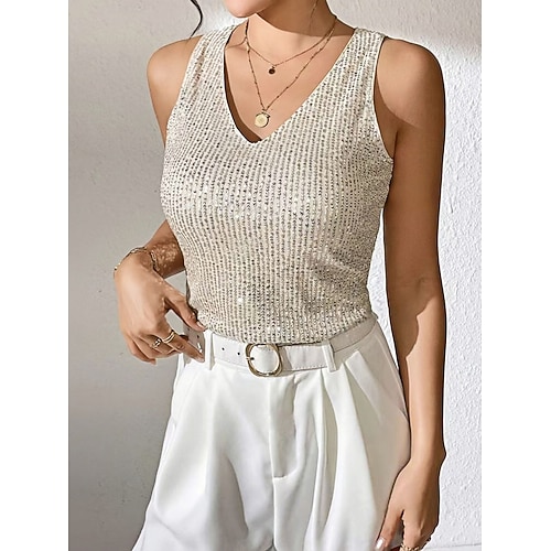 Damen T Shirt T-Shirt Pailletten Einfarbig Mode Sexy Klassisch Ärmellos V Ausschnitt Normale Oberteile Täglich Ausgehen Wochenende Champagner Gold Schwarz Weiß Rosa Rote Sommer Frühling