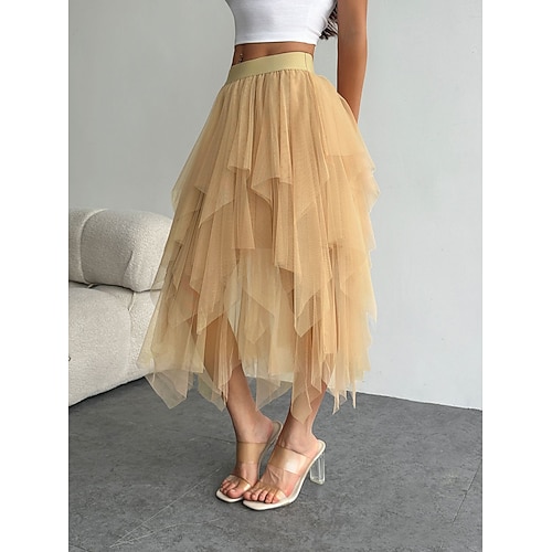 Damen Urlaubsrock Elegant Mode Niedlich Lässig Midi Mittlere Hüfthöhe Röcke Einfach Elastischer Bund Geschichtet Netz Mikroelastisch Täglich Urlaub Schwarz Weiß Champagner Rosa Sommer Polyester