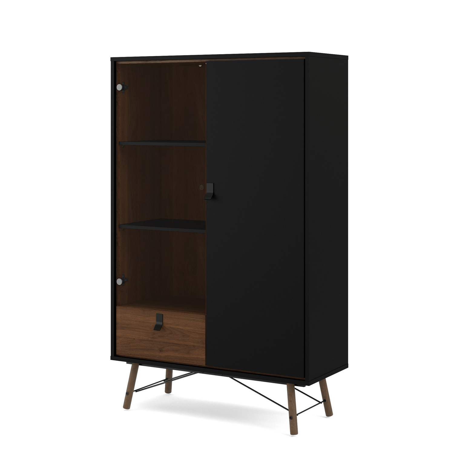 TVILUM Ry Vitrinskåp, med 2 Luckor och 1 Låda - Glas, Valnöt / Svart Folie och Trä
