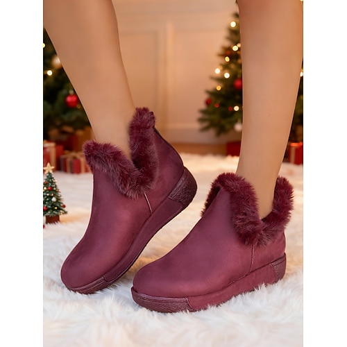 stivali da neve invernali da donna foderati in pelliccia sintetica color bordeaux con cerniera laterale, stivaletti caldi e impermeabili alla caviglia per l'uso all'aperto durante il freddo