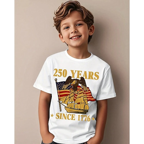 100% Cotone Bambini Ragazzi Nero Bianco Grafico Bandiera 250° anniversario Bandiera americana per bambini Maglietta Blusa Girocollo Manica Corta All'aperto Abbigliamento Quotidiano Moda Streetwear