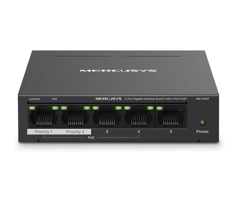 Mercusys MS105GP PoE Switch 5-Port Gigabit LAN Switch mit 4 PoE+ Ports (65 Watt, IEEE-802.3af/at PoE, lüfterlos, Plug-and-Play, Robustes Metallgehäuse)
