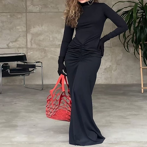 Per donna Vestito nero Abito lungo Abito lungo Poliestere Increspato Tasche Giornaliero Appuntamento Attivo Di tendenza A collo alto Manica lunga Nero Vino Cachi Colore