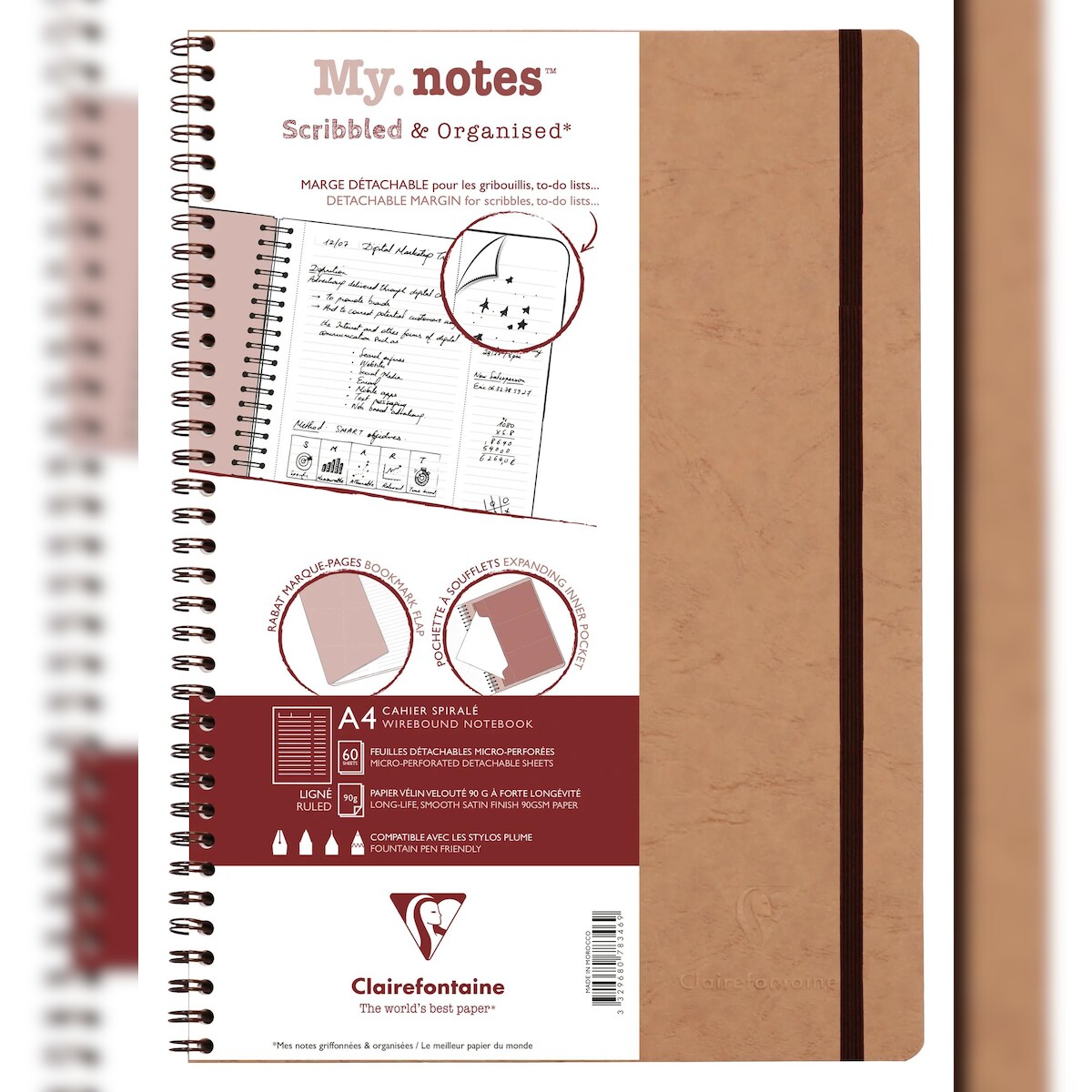 Clairefontaine 5x My.Notes Age Bag, Spiralheft A4, 60 Blatt 90g, liniert mit Kopfleiste, abtrennbar, mikroperforiert - Tabak 78346C