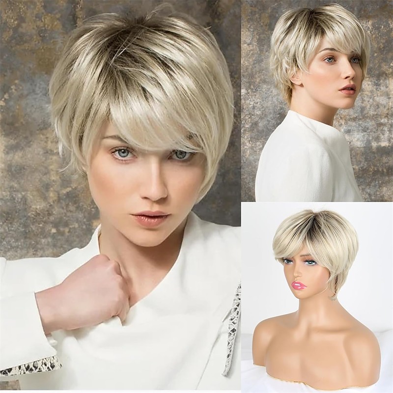 Short Hair Wigs for Women Blonde Wig with Bangs Pixie Cut Wig with Blonde Highlight Tousled Waves/Blended and Brown Rooted Shades(Shades of Blonde White and Brown)