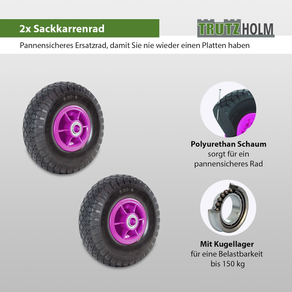 TRUTZHOLM 2x Sackkarrenrad PU-Rad 260x85 mm 3.00-4 60 mm versetze Nabe Ø 20 mm rot Vollgummi Bollerwagen
