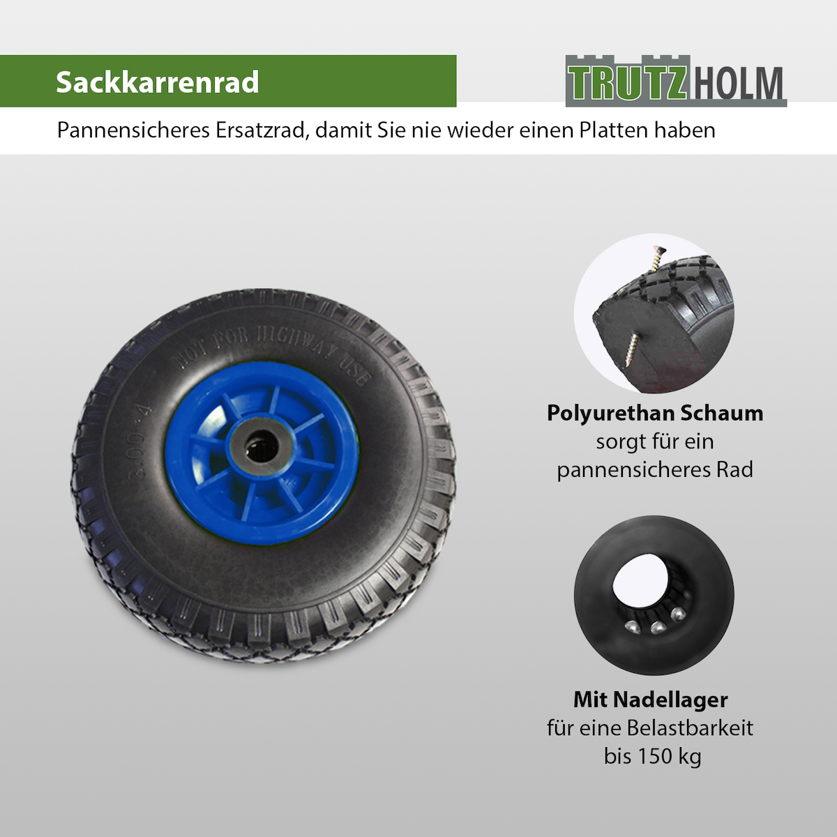 Baumarktplus Sackkarrenrad PU-Rad 260x85 mm 3.00-4 60 mm versetze Nabe Ø 20 mm grau Vollgummi Bollerwagen