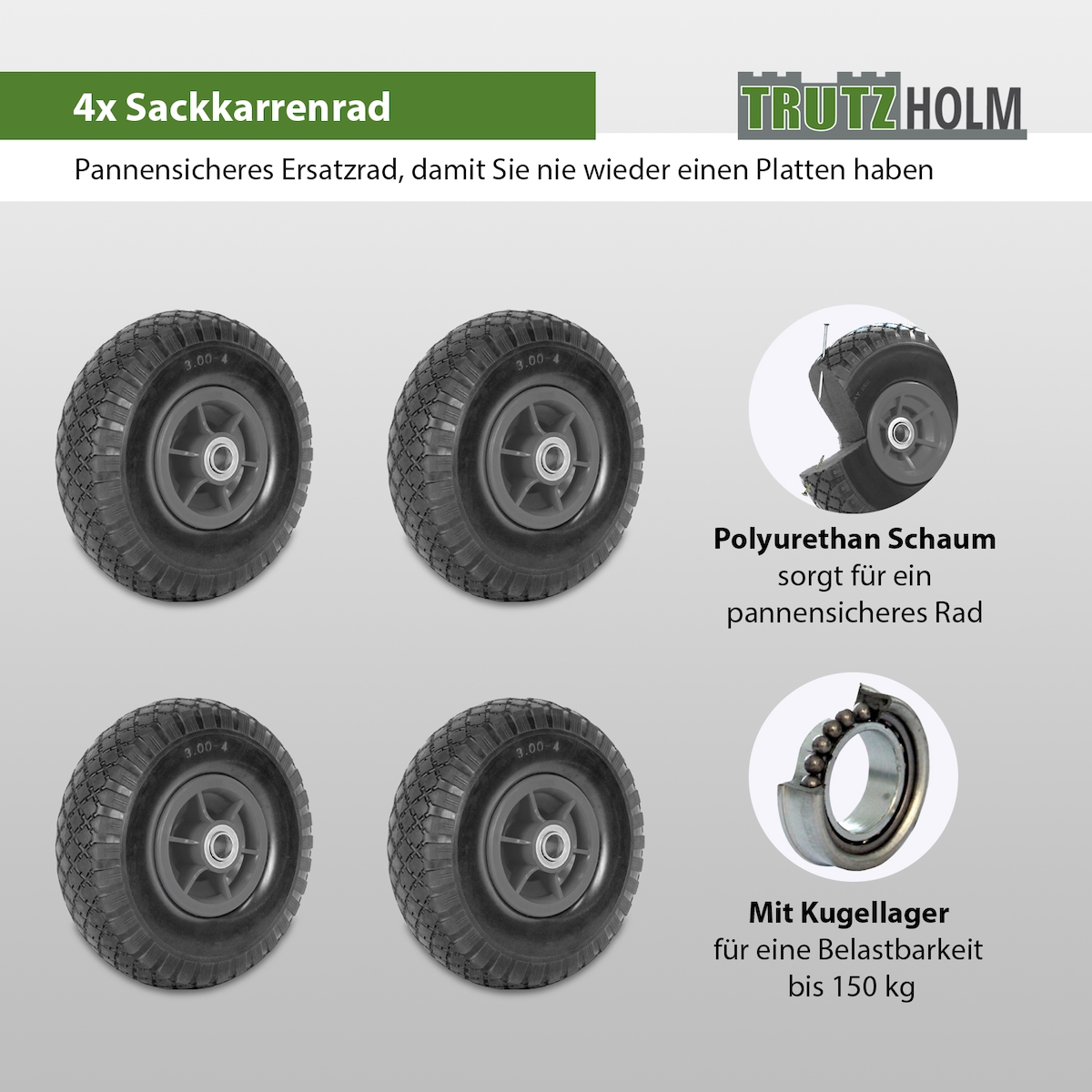 Baumarktplus 4x Sackkarrenrad PU-Rad 260x85 mm 3.00-4 60 mm versetze Nabe Ø 20 mm grau Vollgummi Bollerwagen