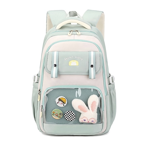 Zaino impermeabile leggero e capiente per bambine con tasca frontale trasparente e simpatica spilla a forma di coniglietto - graziosa borsa da viaggio per la scuola, l'università e i viaggi del fine settimana