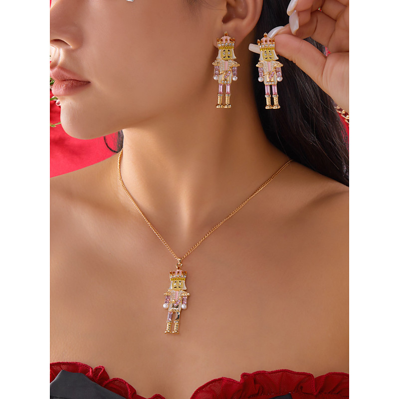 Women's Nutcracker Christmas Jewelry Set, Enamel Soldier Necklace and Earrings in Gold Tone, Festive Holiday Accessory for Winter Parties, Gifts Outfits