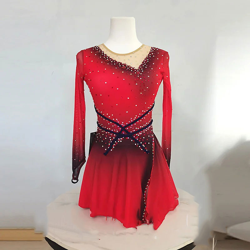 Figure Skating Dress Women's Girls' Ice Skating Dress Red High Elasticity Training Competition Skating Wear Classic Crystal / Rhinestone Long Sleeve Ice Skating Figure Skating