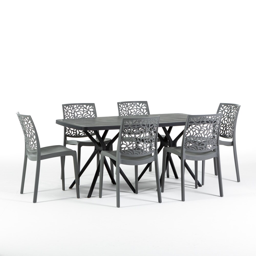 RATTATAN GARTEN-ESSSET OLIVER + 6 STÜHLE ANNA aus Harz mit Glasfaser, modernes und robustes Design, ideal für Garten, Terrasse oder Veranda – Grau/Schwarz