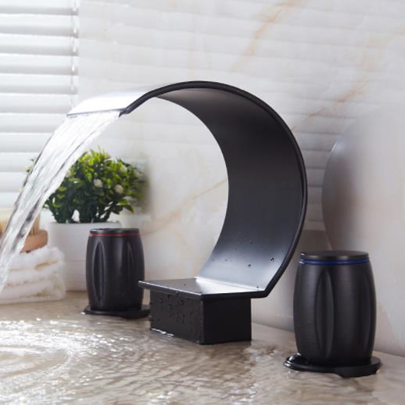 Bathroom Sink Faucet,Elegant Double Handle Arc Waterfall Spout Bathtub Filler Faucet with Three Holes Widespread Bathroom Faucet Gold/Matte Black
