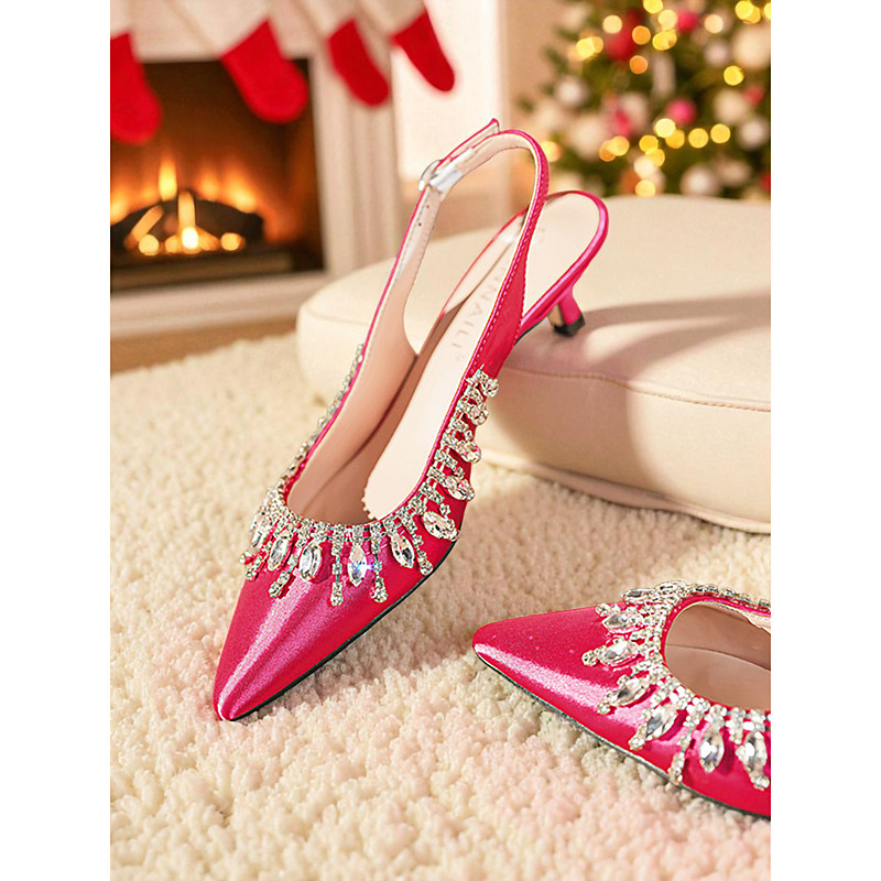 Women's Pink Satin Slingback Heels, Rhinestone Embellished Pointed Toe Kitten Heels for Christmas Parties Holiday Celebrations