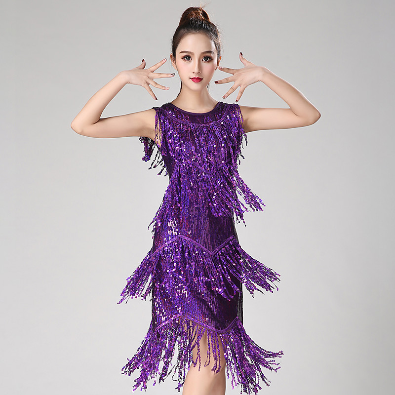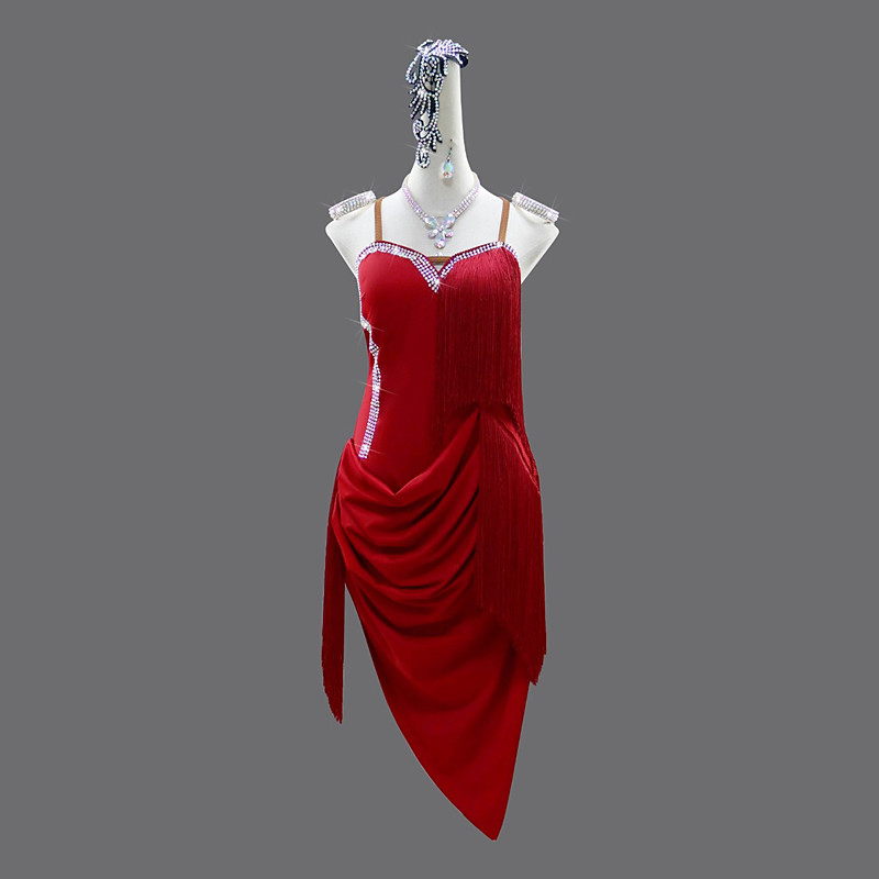 Latin Dance Dress Rhinestone Tassel Splicing Women's Performance Training Sleeveless Spandex