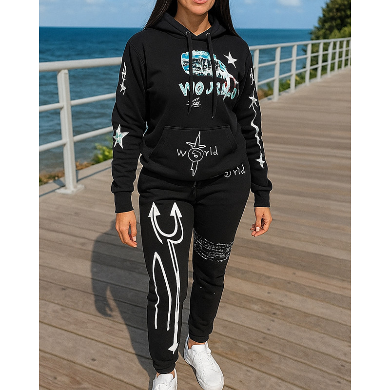 Women's 2 Piece Tracksuit Lounge Hoodie Sweatsuit Sets Pocket Printed Clothing Suit Fall Black White Outdoor Travel Sports Moisture Wicking Long Sleeve Sport Activewear Micro-elastic Regular Fit