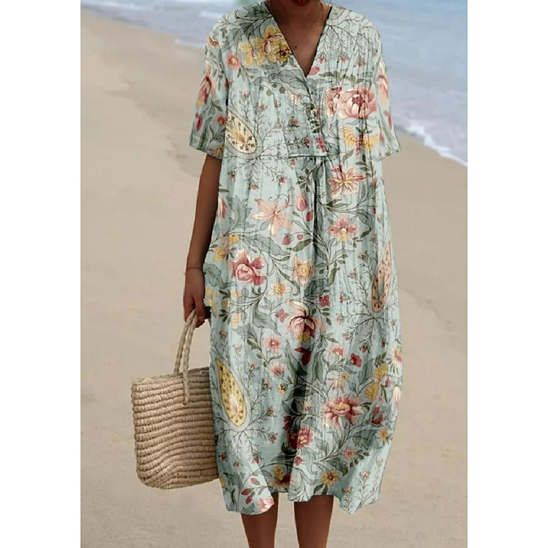 Women's Midi Dress Sundress A Line Dress Linen Vacation linen like Casual Beach Going out Loose Fit Floral Graphic Short Sleeve V Neck Light Yellow Light Green Light Purple