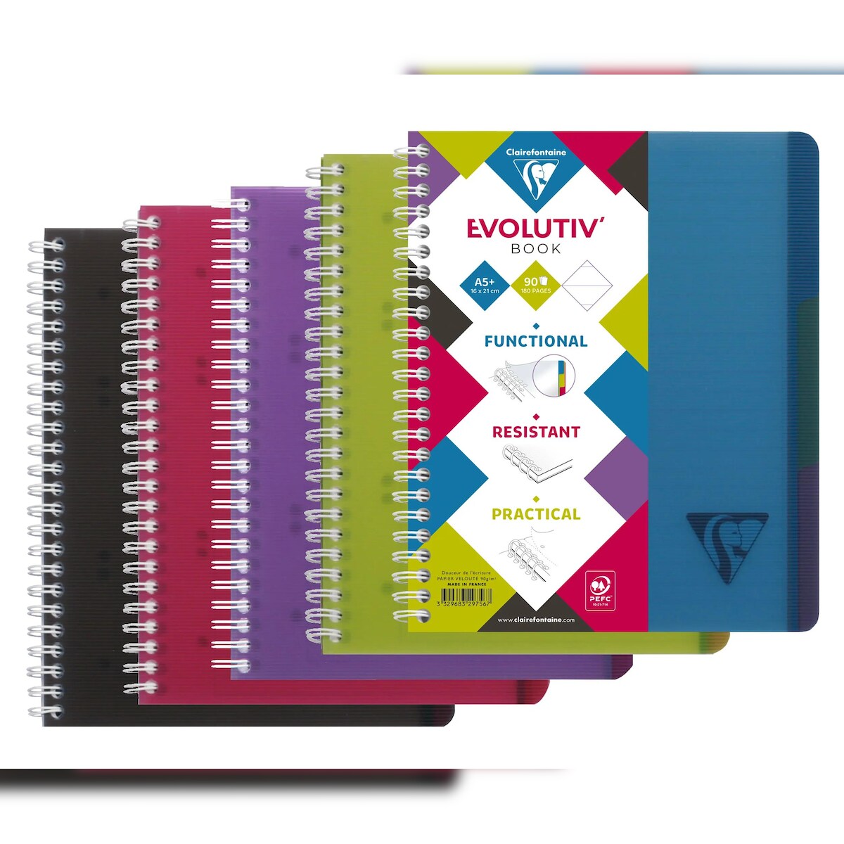 Clairefontaine 5x Evolutiv'Book mit Doppelspirale und Deckel aus PP, 4-fach Lochung und mikroperforiert, 16x21cm, 90 Bl, 90g - Sortiert 329756C