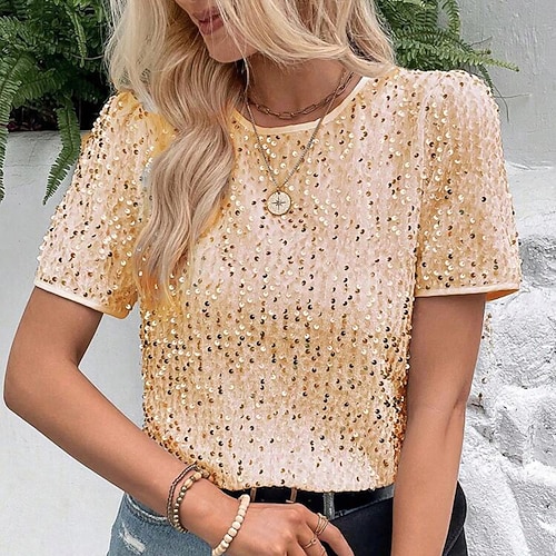 Per donna Maglietta Top estivi Tinta unica Elegante Vintage Classico Manica Corta Girocollo Top Regolari Quotidiano Uscire Weekend Paillettes Patchwork Oro rosa Nero e grigio Nero Bianco Rosa Estate