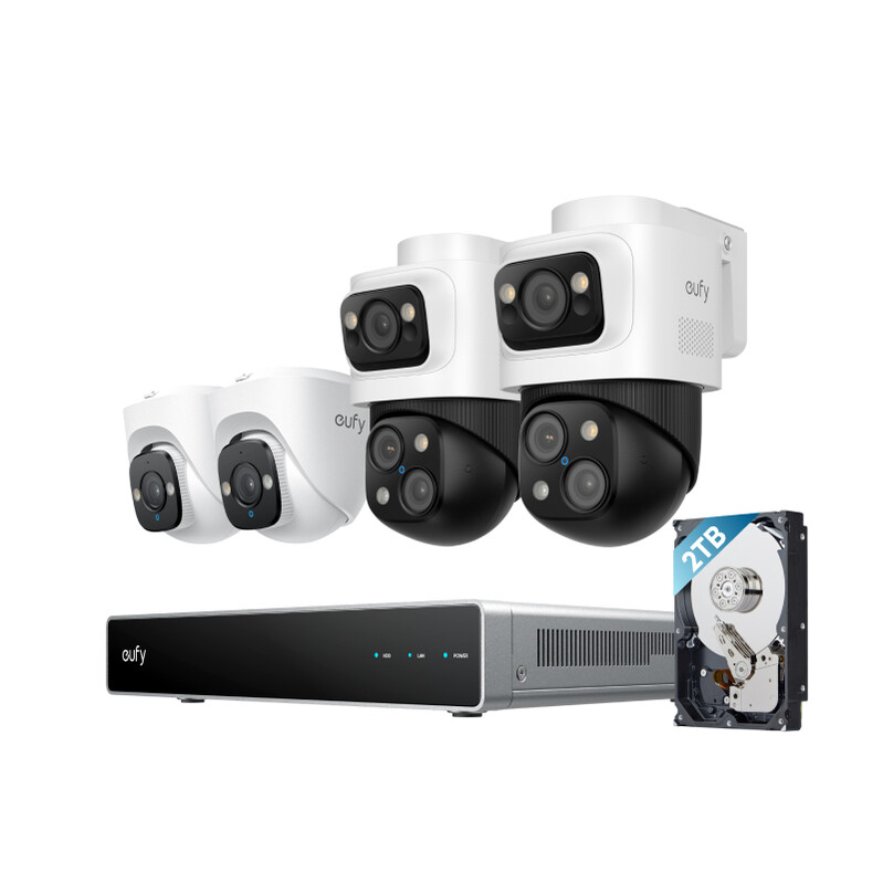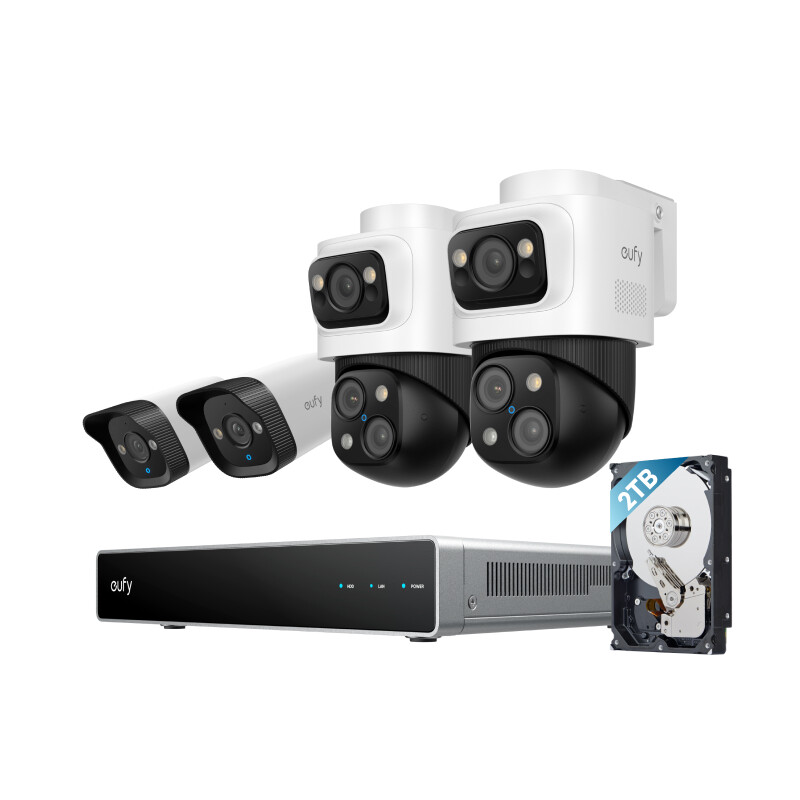 eufy PoE NVR Security System S4, 2× Bullet-PTZ-Kameras, 2X Bullet-Kameras, 360° PTZ, KI Auto-Framing&Tracking, smarte Videosuche,Farbnachtsicht,rot-blaues Stroboskop,2TB HDD integriert,24/7