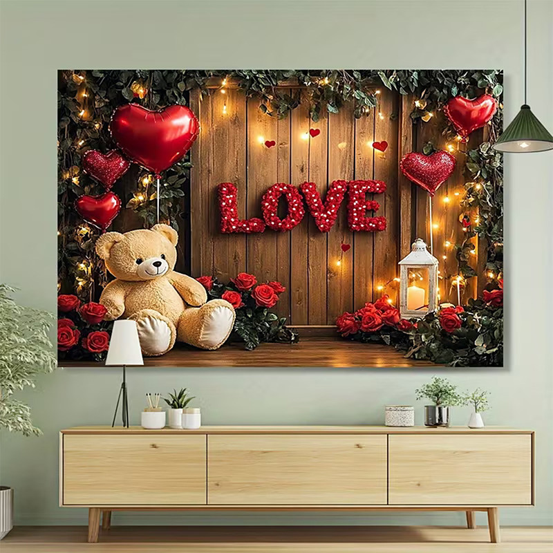 Valentine's Day Garage Door Cover, 2D Flat Print Red Bear Holding Roses and Heart, Rose Wall, White Gift Box with Red Ribbon, Perfect Holiday Decor for Garage, Storefront, or Home