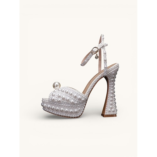 Scarpe da sposa eleganti con tacco alto e plateau color avorio e perle, per matrimoni in chiesa