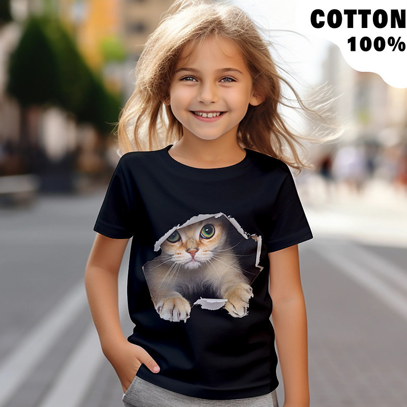 Girls' 3D Cat T shirt Tee Short Sleeve Summer Spring Fashion Basic Kids 4-12 Years Crew Neck Outdoor Casual Daily Regular Fit