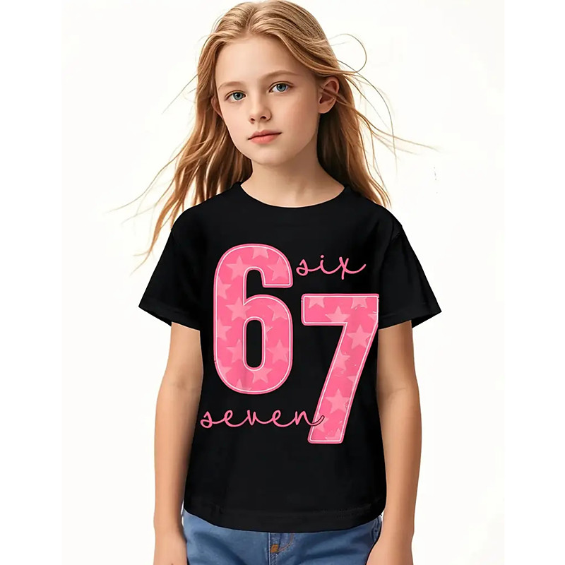 Cotton Kids Girls' Black Graphic Funny Slang 67 T shirt Tee Crew Neck Short Sleeve Vacation Sports Outdoor Dailywear Casual Printing Summer