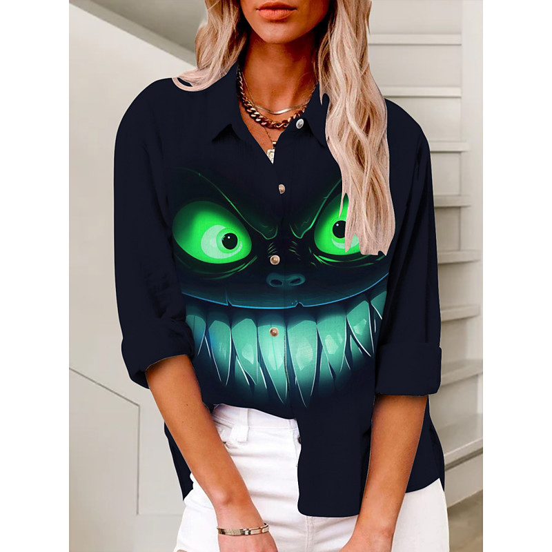 Women's Cartoon Funny Smile Face Shirt Graphic Active Daily Stylish Long Sleeve Shirt Collar Regular Tops Daily Holiday Buttons Print Blue Spring Fall