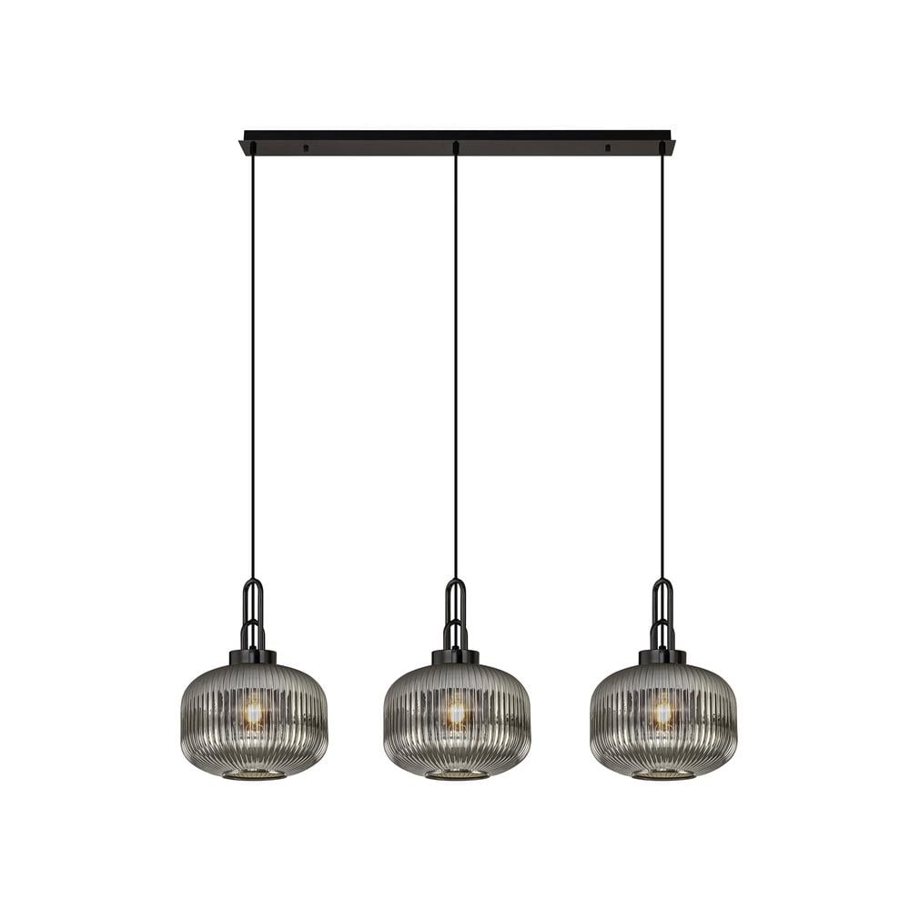 Kennith Linear 3 Light Pendant E27 Black Chrome/Matt Black With 30cm Pumpkin Shaped Ribbed Smoked Glass Luxuria
