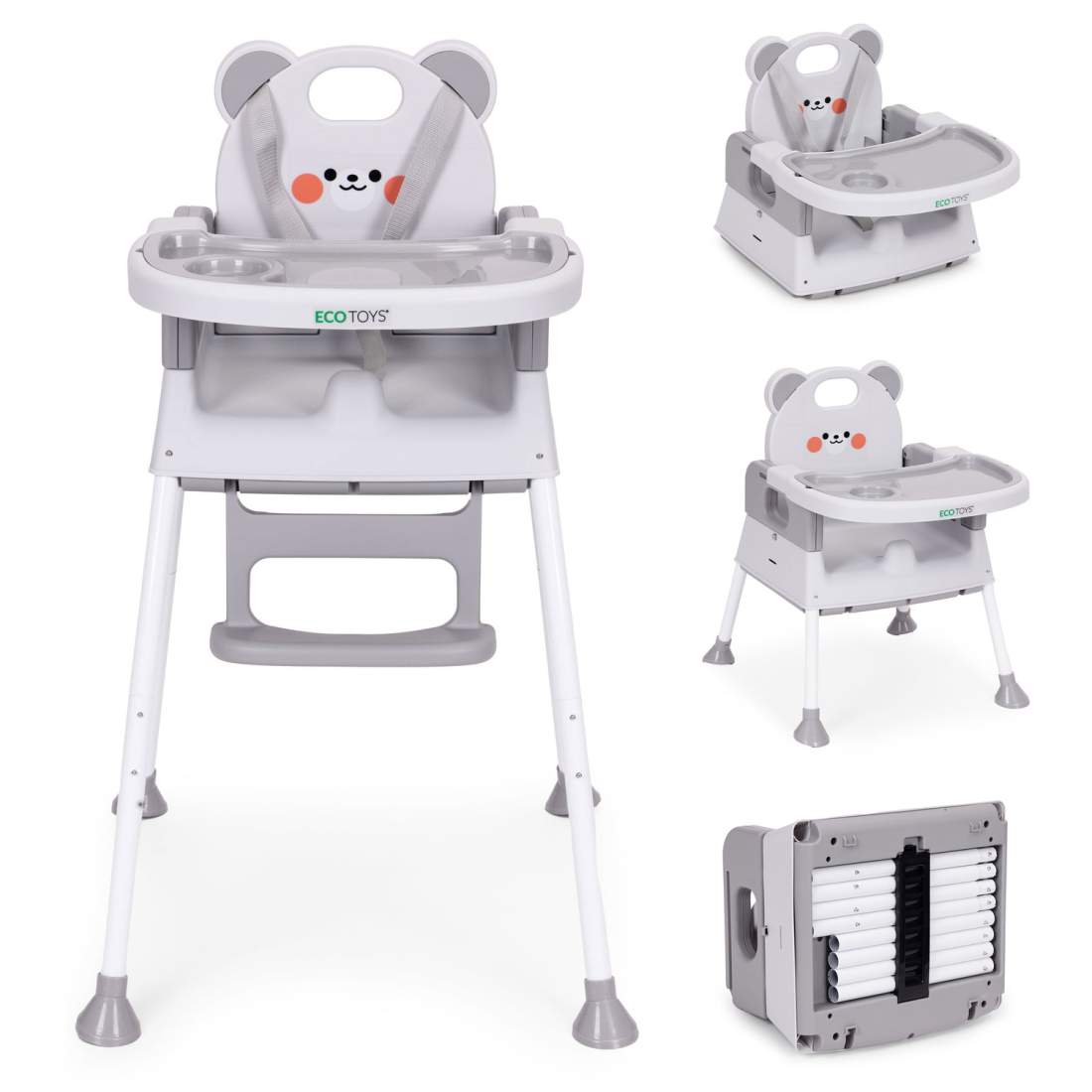 3-in-1-syöttötuoli, jossa on kaksi tarjotinta ja turvavaljaat