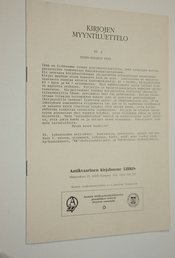 Kirjojen myyntiluettelo nro 2/1990 (touko-kesäkuu)