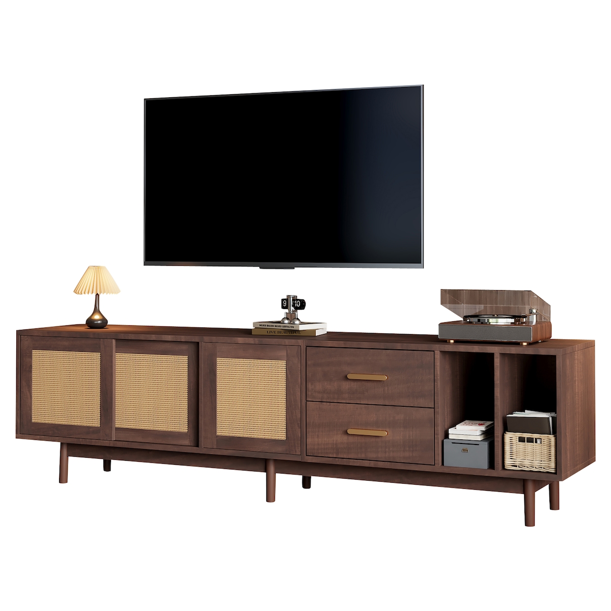 OKWISH TV-Schrank 190x40x52 cm Braun Rattan MDF mit 3 Türen 2 Schubladen halboffene Ablage große Plattform Wohnzimmer Stauraum für 75-Zoll Fernseher