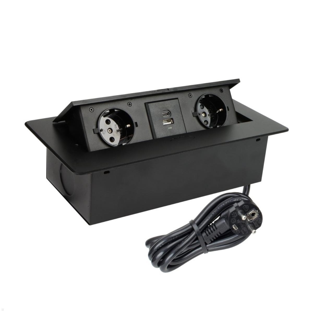 TecLines TES009B 2-fach Einbausteckdose mit USB A/C Charger, 3m Kabel, schwarz