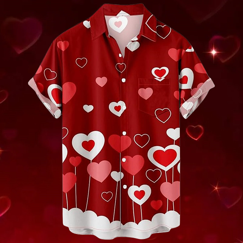 Valentine's Day Heart Romantic Men's Resort Hawaiian 3D Printed Shirt Button Up Short Sleeve Summer Beach Vacation Daily Wear S TO 3XL